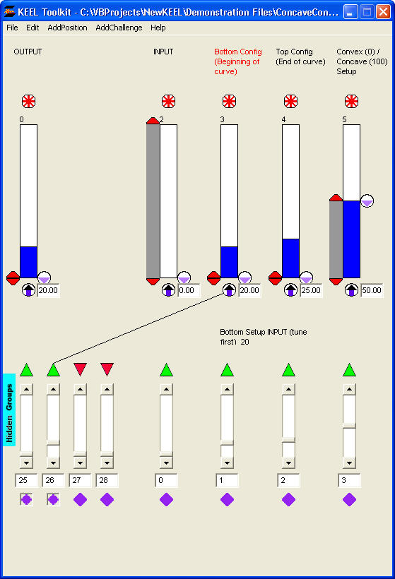 With this curve the lower "base" (index 1) and the upper end of the curve (index 2) can be set with input variables. The curve can also be changed from convex to concave using another input (index 3). When input (index 3) is set to 50, a straight line results.