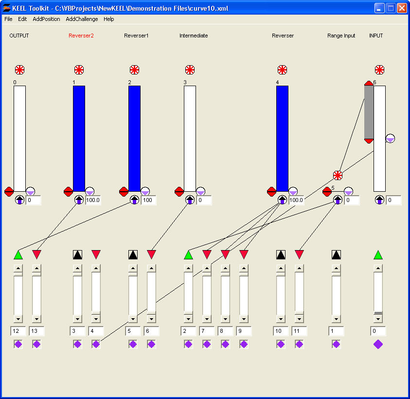In this case, the upper clipper of the "INPUT" is set at 100% and the lower clipper is set at 50%. The clipper window of the "INPUT" is used to drive the "Range Input" importance. The "Range Input" is used to drive the curve. The curve, itself, is created by driving the "Reverser" and the "Intermediate" positions. The "Intermediate" position provides an intermediate result. This provides a gradually increasing slope curve at the modified value of the "Intermediate" position. This curve is then inverted through "Reverser1" which is used to drive the supporting argument for the "OUTPUT".
