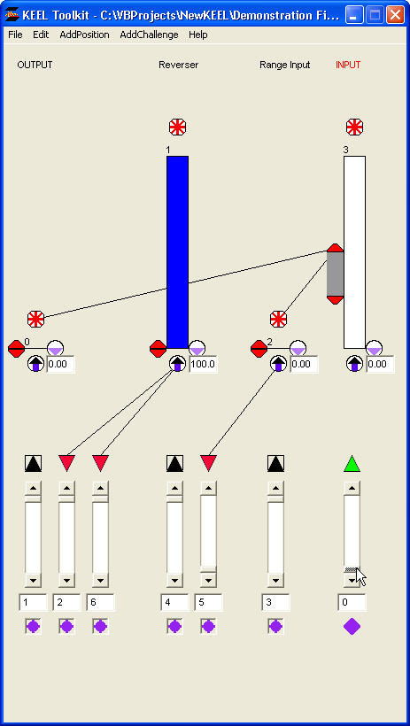 In this case we are limiting the "OUTPUT" position to the clipper window range of the "INPUT" position. The output from the "INPUT" clipper window is driving the importance of the "Range Input" and of the "OUTPUT". The "Range Input" is inverted through a "Reverser" whose impact is doubled.